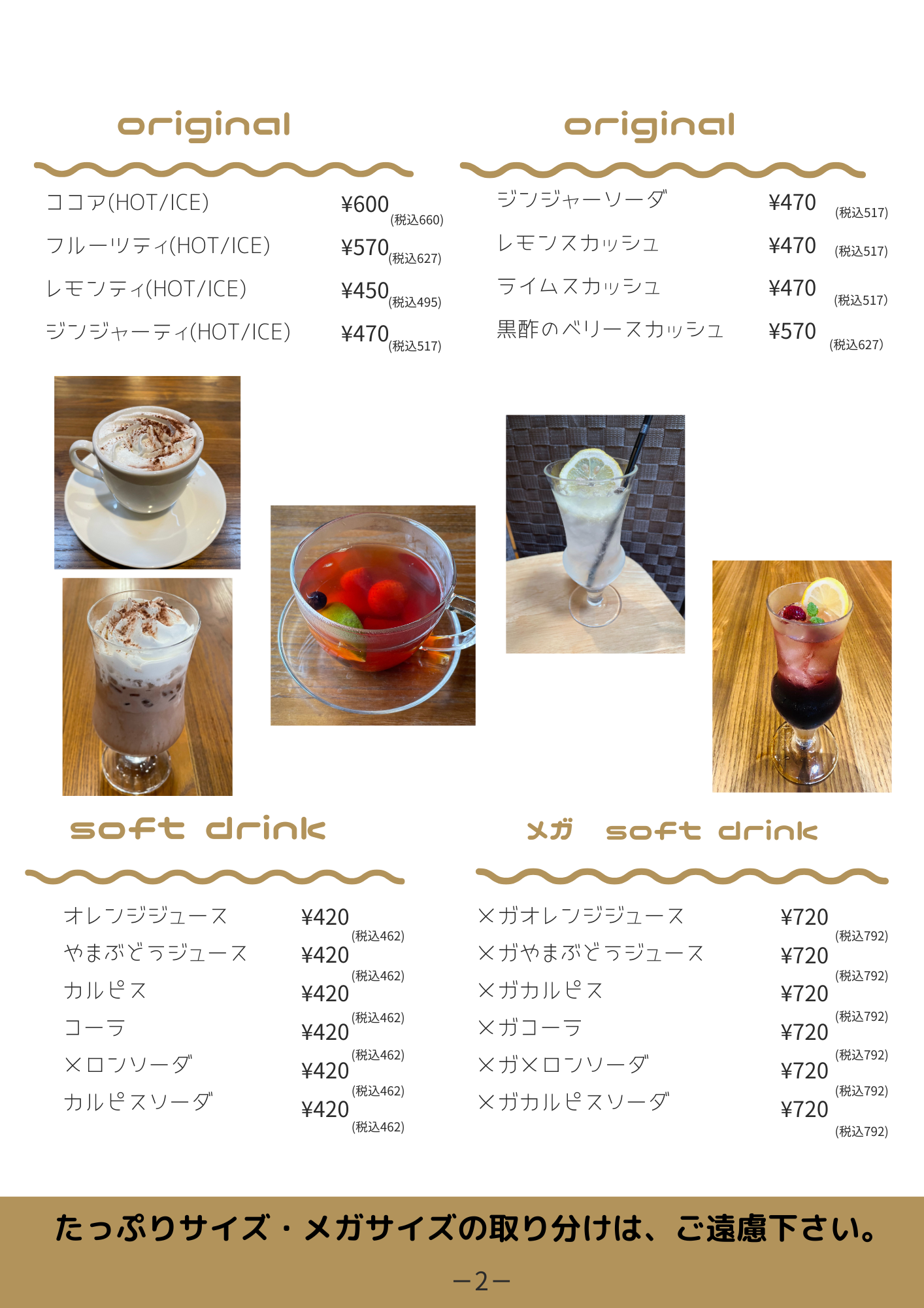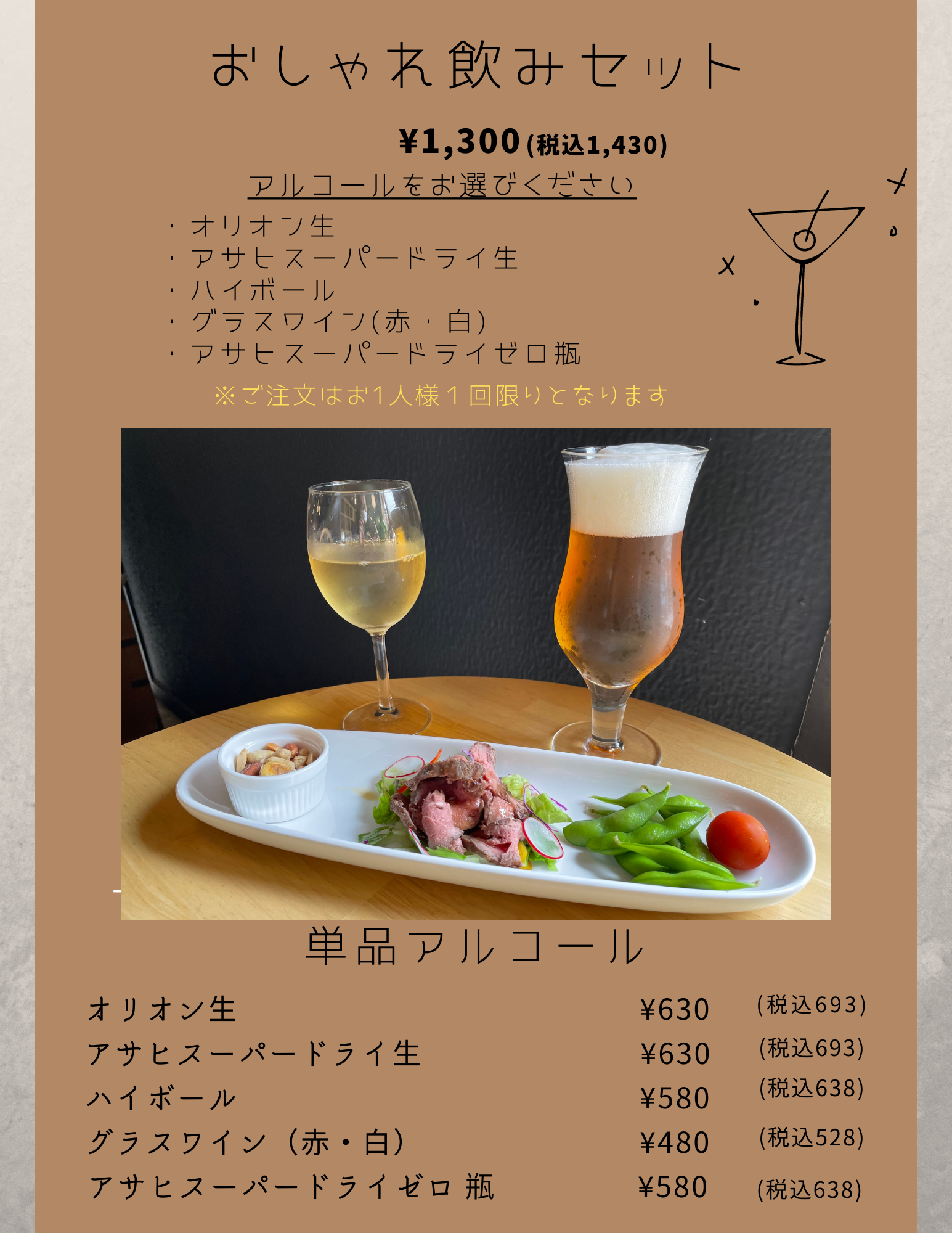 平日の食事メニューは下記となります。ドリンク&デザートは変更ありません。また、平日はサラダビッフェとHOTコーヒーが付きます。※除外日あり