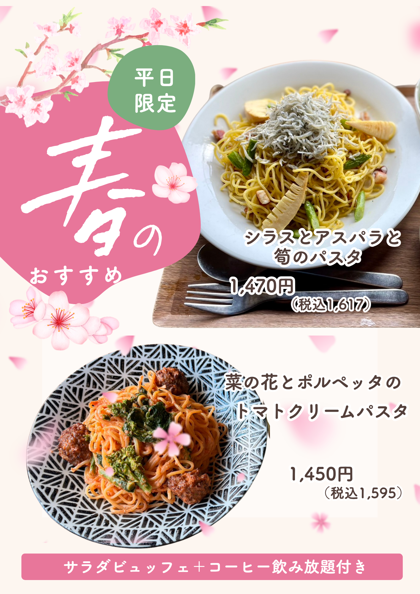 平日の食事メニューは下記となります。ドリンク&デザートは変更ありません。また、平日はサラダビッフェとコーヒーが付きます。※除外日あり