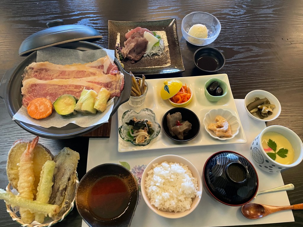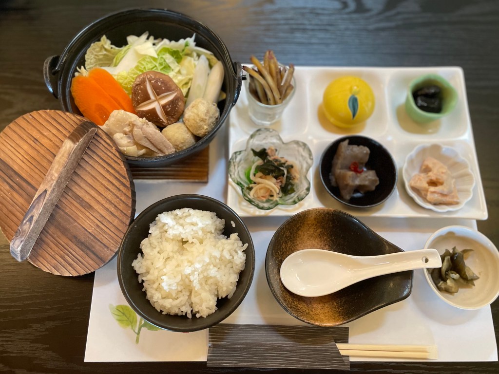 地元の野菜を沢山使用しています。豆乳鍋ORローズポークの味噌漬け焼きを団体様ごとに選ぶことができます。日替わり小鉢が6品ついております。