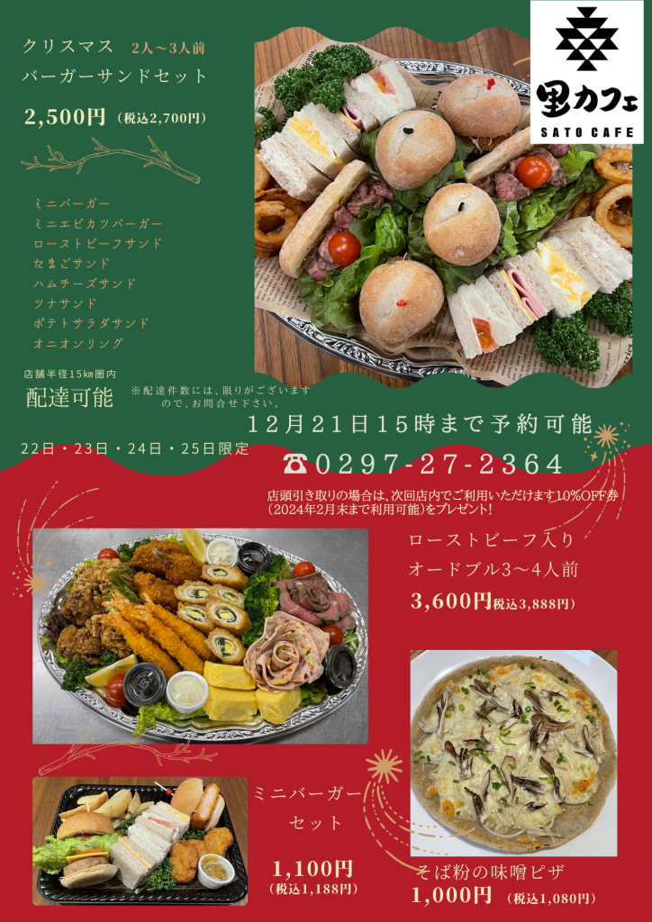 クリスマスオードブルご予約承り中 投稿者:asunaronosato2023年12月6日カテゴリー:未分類タグ:ファミリー、里カフェ 自然博物館、常総市 坂東市 いつも里カフェをご利用いただきまして誠にありがとうございます。2023年クリスマスオードブルのご予約を開始しました。数に限りがございますのでお早目にご注文下さい。よろしくお願いいたします。 共有: クリックして X で共有 (新しいウィンドウで開きます) X Facebook で共有するにはクリックしてください (新しいウィンドウで開きます) Facebook いいね 読み込み中… 関連